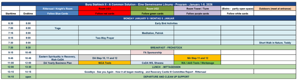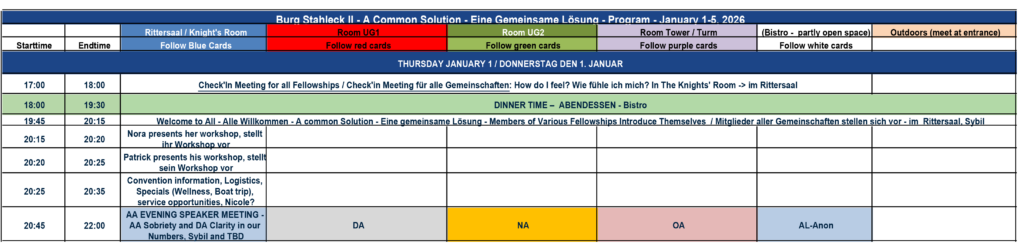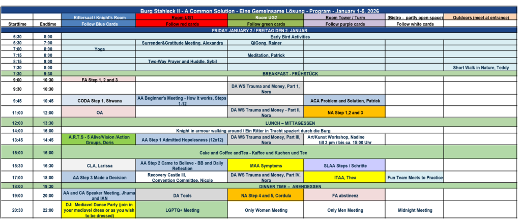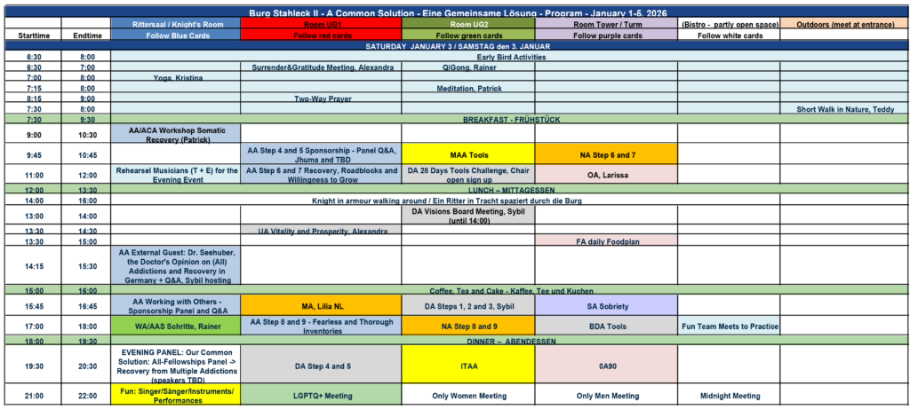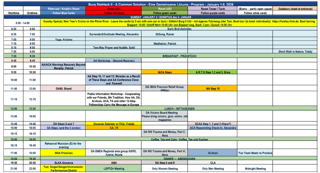 Burg Stahleck Meeting Schedule/Programm All 12 step groups Program PDF Download, Version 24, 21.12.25 Only AA Program PDF Download, Version 24, 21.12.25